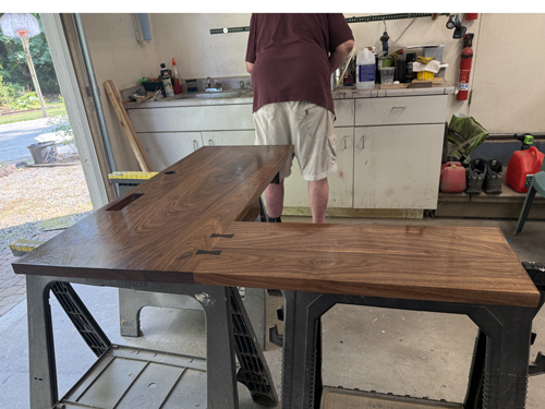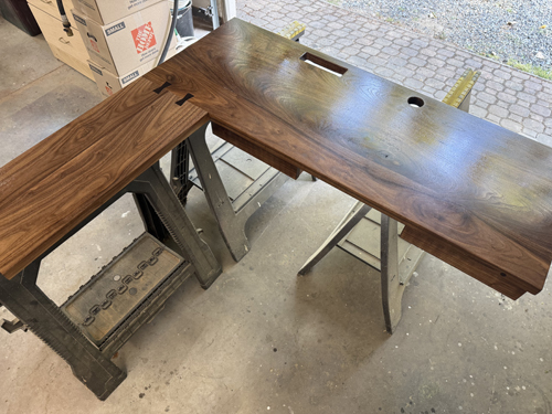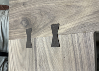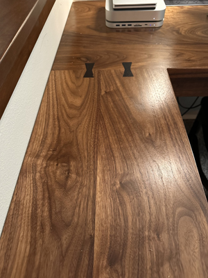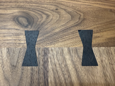 I decided to add two Bow Ties at the desktop joint. I wanted to make then stand-out from the Walnut so I chose to use Wenge (Millettia laurentii) found in Central Africa. It was very hard, dark and even had a warning label about prolonged breathing of the Wenge dust. Below are two videos that show the proccess of cutting the actual Bow Tie.