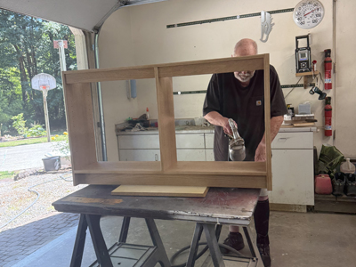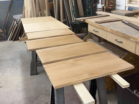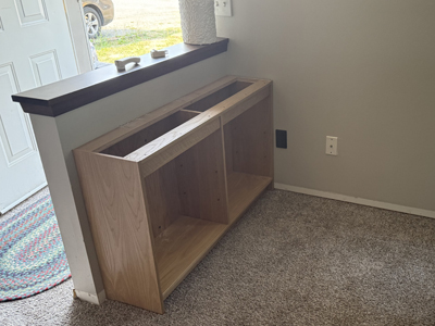 The bookcase was made of White Oak and used a different finish than the desktop, so it was built and finished separately along with the adjsutable shelves.