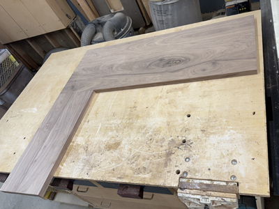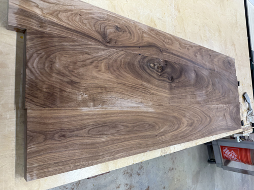 This view is the main top, rough cut to length and laid out in a grain pattern that looked good. The white chalk marks are just to help me remember what I decided for future reference. In almost every case the end layout could change to fit the exact size and pattern of the finished grain.